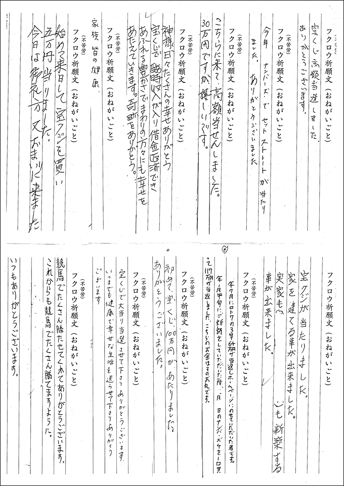 「宝くじ当選御礼、金運福徳感謝」等の御礼文の紹介